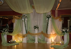 Fabric draping is a great way to add drama and elegance to a venue. Choose from rays, stars, swags, flags, drapes, cascading waterfalls, chandeliers, wall, and more. Our signature fabric draping are spectacular, yet a cost-effective event and wedding reception decorating concept. |